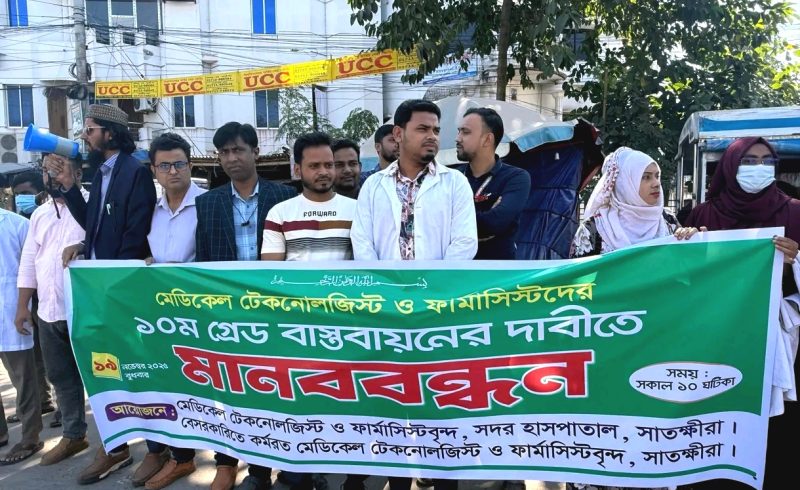 ১০ম গ্রেড বাস্তবায়নের দাবিতে সাতক্ষীরায় মেডিকেল টেকনোলজিস্ট ও ফার্মাসিস্টদের মানববন্ধনস্টাফ রিপোর্টার, সাতক্ষীরা: ১০ম গ্রেড বাস্তবায়নসহ চাকরি কাঠামো পুনর্বিন্যাসের দাবিতে সারাদেশের ন্যায় সাতক্ষীরাতেও মানববন্ধন কর্মসূচি পালন করেছেন সরকারি ও বেসরকারি মেডিকেল টেকনোলজিস্ট এবং ফার্মাসিস্টরা। বৃহস্পতিবার সকালে সাতক্ষীরা সদর হাসপাতাল সংলগ্ন খুলনা