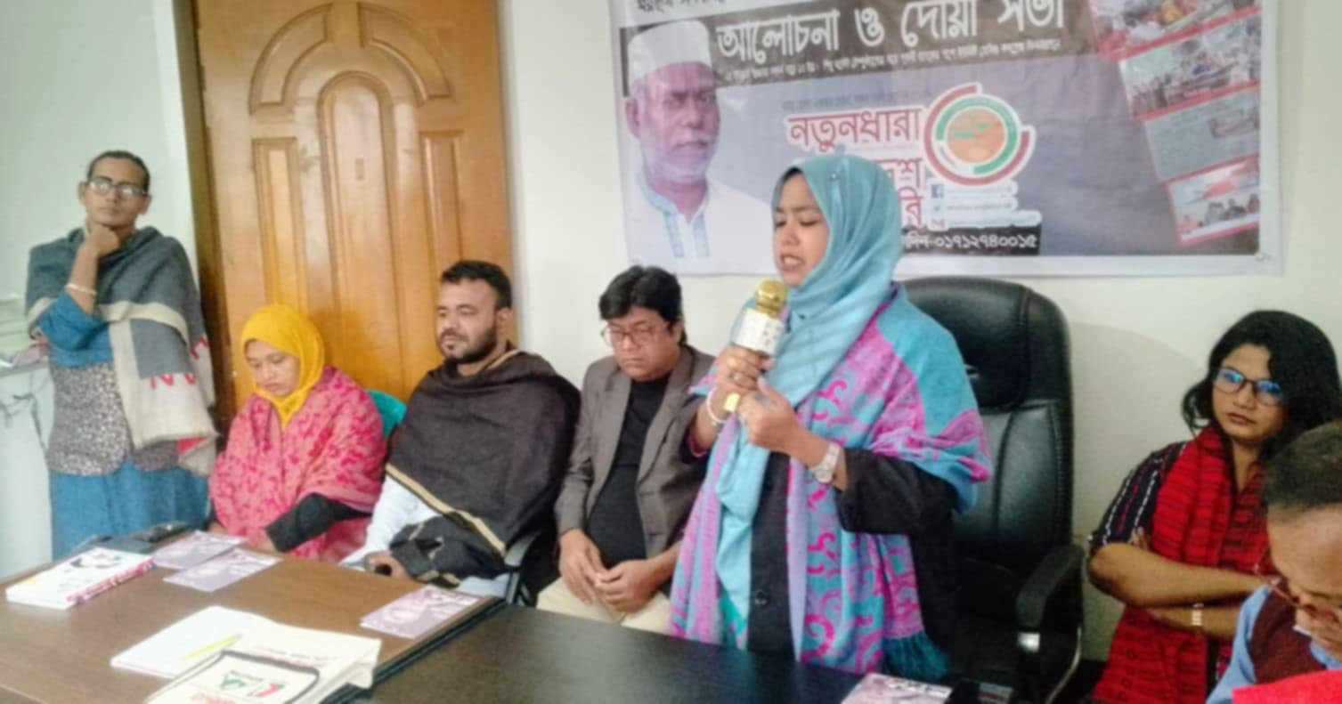 শুক্রবার (২৪ জানুয়ারি) বেলা ১১ টায় নারায়ণগঞ্জের ফতুল্লার শিবু মার্কেটস্থ ইউনিটি হোমিও কেন্দ্রে নতুনধারা বাংলাদেশ এনডিবির চেয়ারম্যান মোমিন মেহেদীর সভাপতিত্বে অনুষ্ঠিত সভায় বক্তারা উপরোক্ত কথা বলেন। এতে অতিথি হিসেবে বক্তব্য রাখেন দৈনিক বিজয় সম্পাদক সাব্বির আহমেদ সেন্টু, দৈনিক ইয়াদ-এর সম্পাদক মনিরুল ইসলাম সবুজ, নতুনধারা বাংলাদেশ এনডিবির ভাইস চেয়ারম্যান শান্তা ফারজানা, দৈনিক পূর্বাভাস-এর সহ-সম্পাদক সোনিয়া দেওয়ান প্রীতি, নতুনধারা বাংলাদেশ এনডিবির ভাইস চেয়ারম্যান ডা. নূরজাহান নীরা ও সদস্য আল আমিন বৈরাগী। স্মৃতিচারণ করেন সাংবাদিক মহসীন আলম, সাংবাদিক মো. জাহাঙ্গীর হোসেন, কবি আলতাফ হোসেন রায়হান, ডা. মো. ইলিয়াস, ডা. হাবিবুর রহমান, ডা. এনসি দাস, কবি সুমনা আক্তার লুবনা, মো. সাগর মিয়া প্রমুখ। দোয়া পরিচালনা করেন ডা. মহসীন আলী।