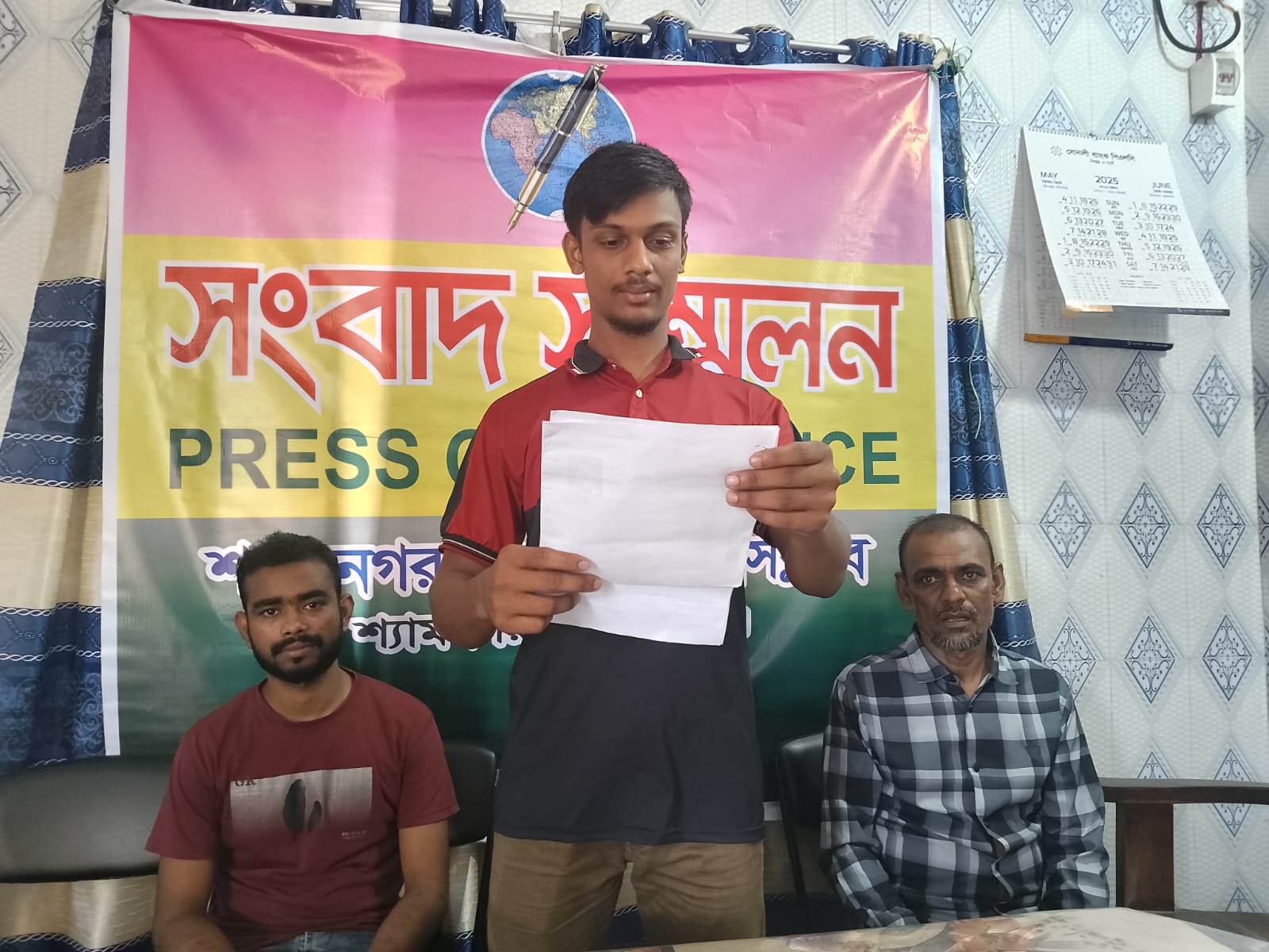 গত ৬ এপ্রিল সকাল দশটায় শ্যামনগর উপজেলা প্রেসক্লাবে সংবাদ সম্মেলনে লিখিত বক্তব্য পাঠ করেন উপজেলার চন্ডিপুর গ্রামের আব্দুল গফুর এর পুত্র মেহেদী হাসান।