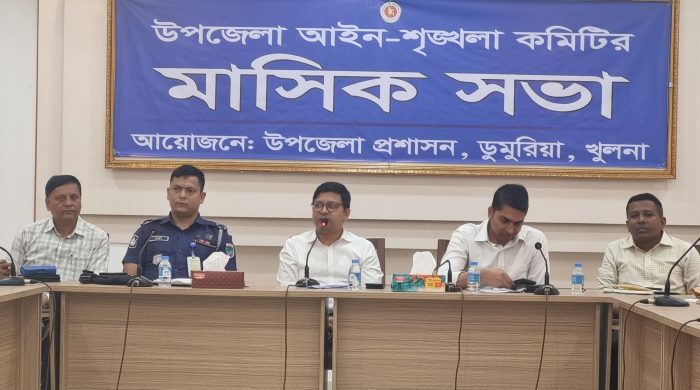 ডুমুরিয়া উপজেলা প্রশাসনের আয়োজনে আইন-শৃঙ্খলা কমিটির মাসিক সভা অনুষ্ঠিত হয়েছে। বুধবার সকাল ১০টায় উপজেলা কমপ্লেক্স সম্প্রসারিত প্রশাসনিক ভবনে এ সভার আয়োজন করা হয়। উপজেলা নির্বাহী কর্মকর্তা (ইউএনও) মুহাম্মদ আল আমিনের