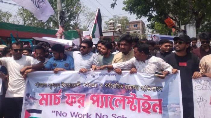সারা বিশ্ববাসীর ন্যায় গাজায় চলমান নৃশংস ইসরায়েলী গণহত্যা বর্বরোচিত হামলা ও মানবতার চরম সীমা অতিক্রম করায়, বিশ্বমানবতা’র বিরুদ্ধে কোনও পদক্ষেপ না গ্রহণ করার প্রতিবাদে পাইকগাছায় মার্চ ফর প্যালেস্টাইন বিক্ষোভ মিছিল