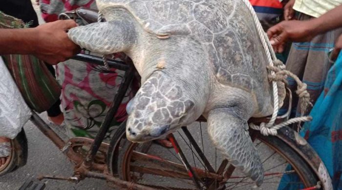 দেবহাটার ইছামতি নদী থেকে পেতে রাখা জালে ধরা পড়লো বিশাল আকৃতির এক কচ্ছপ। দেবহাটার বসন্তপুর শ্লুইচ গেটের পাশ থেকে এই কচ্ছপটি ধরা পড়ে। স্থানীয়রা জানান, দেবহাটা গ্রামের শামছুর রহমানের